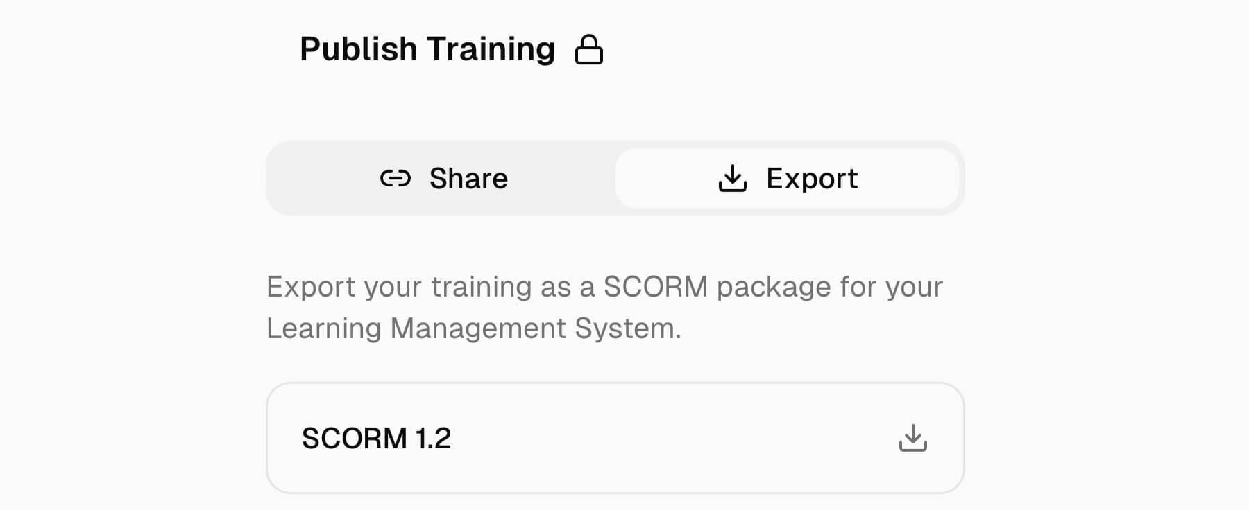 Download SCORM packages for your LMS or share a direct link. Get training to your team in one click.
