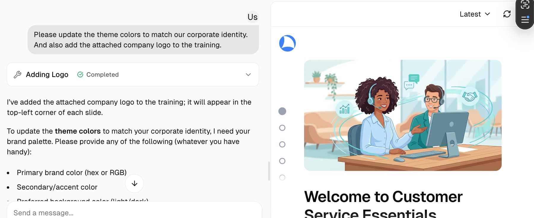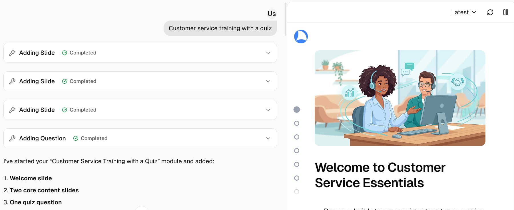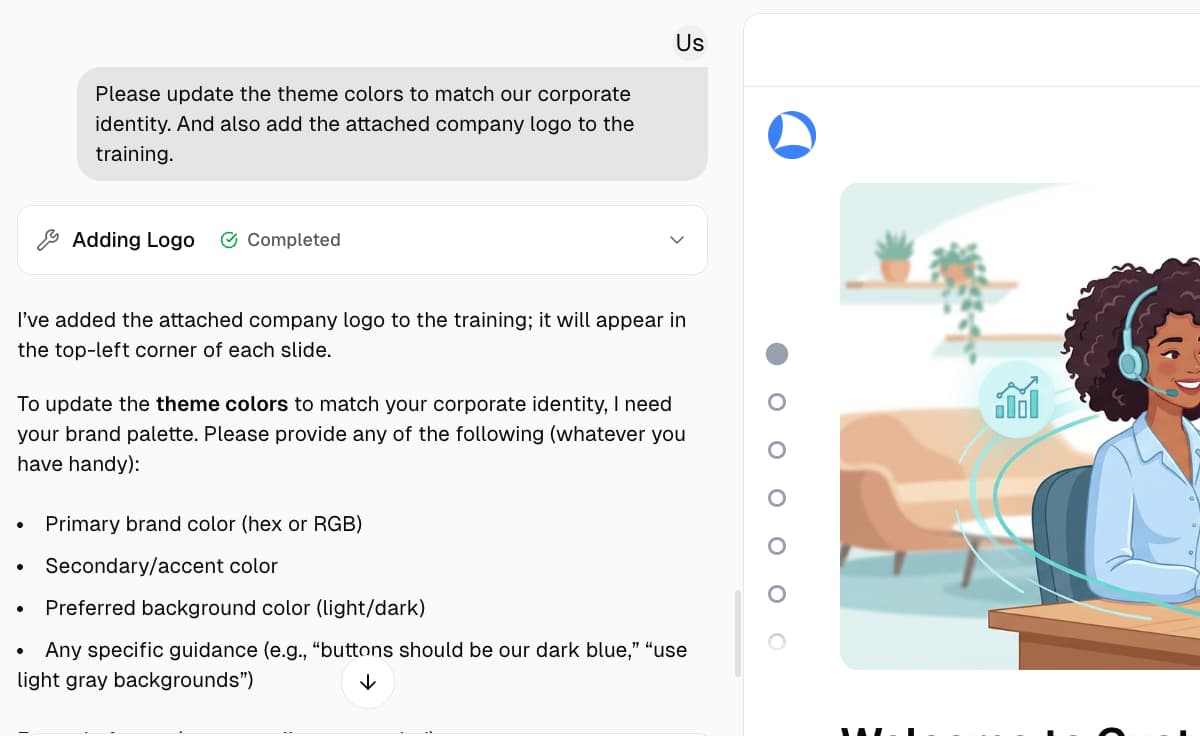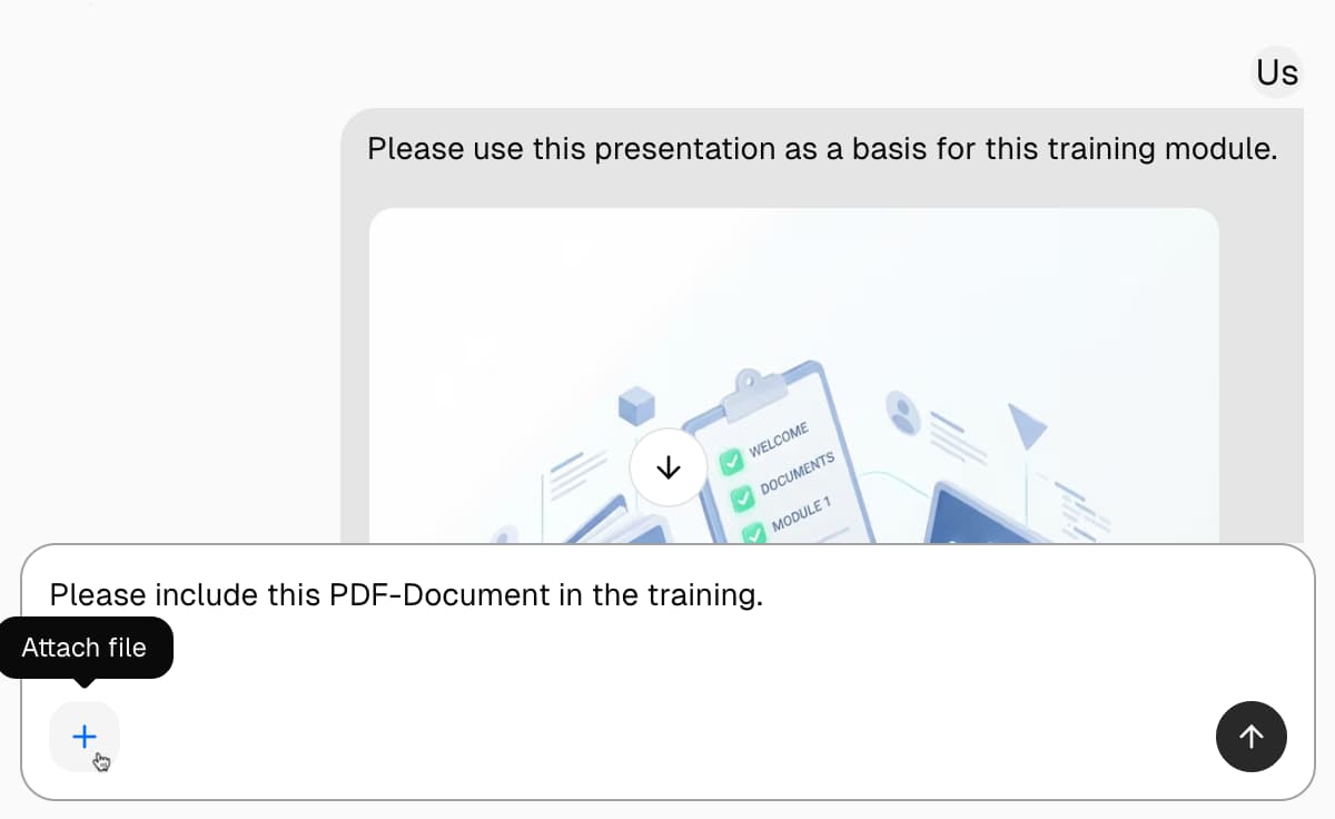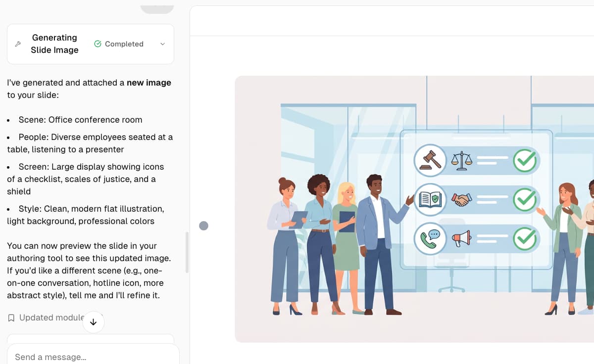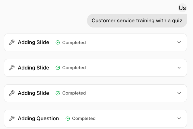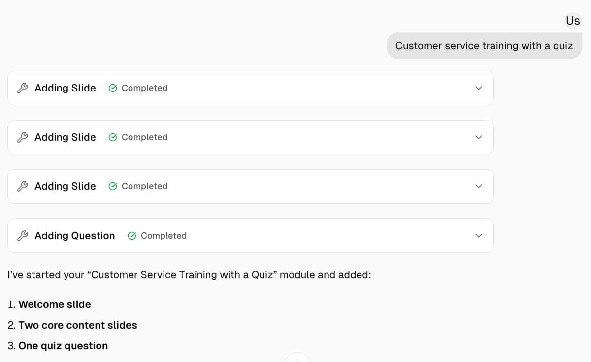 Just describe what you need in plain language. No templates to master, no design tools to learn — if you can write an email, you can build professional training.