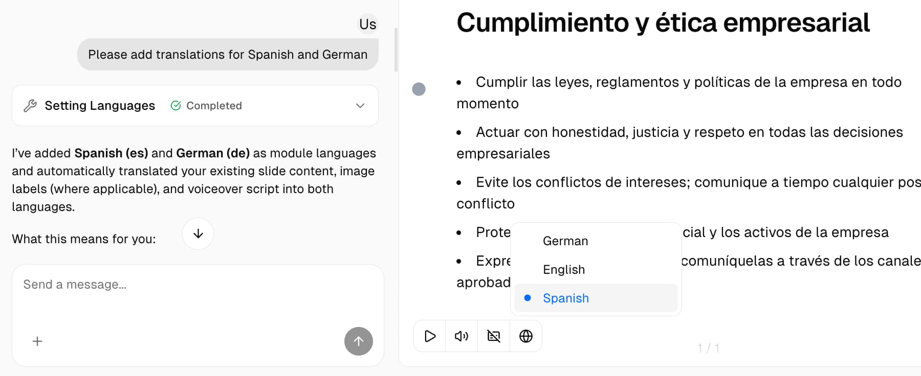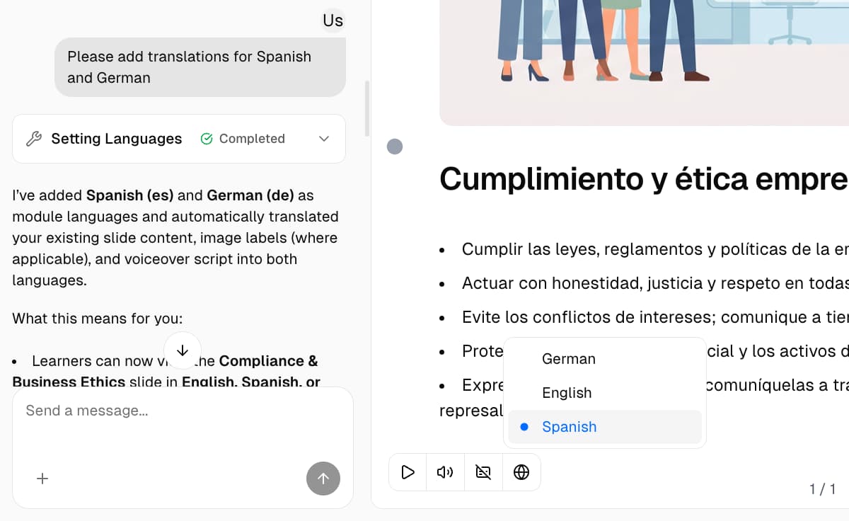Translate your entire training to 160+ languages with one click. Our AI adapts terminology, tone, and complexity for every audience — no manual localization needed.