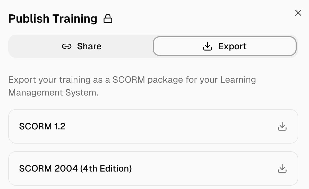 Download SCORM packages for your LMS or share a direct link. Get training to your team in one click.