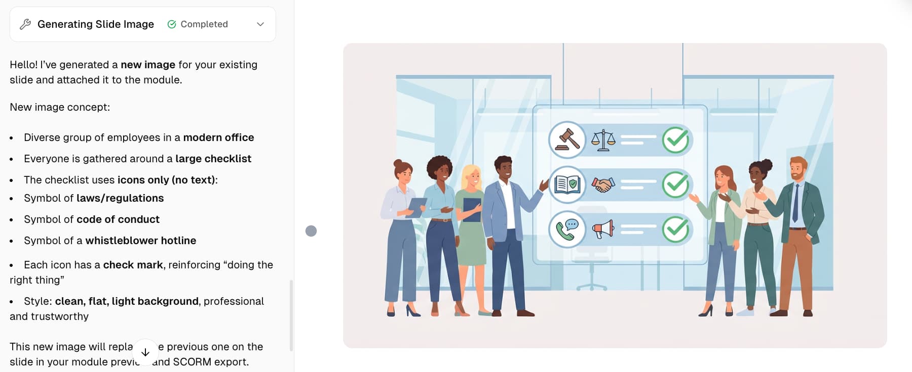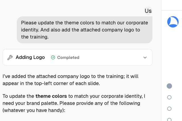 Just describe what you need in plain language. No templates to master, no design tools to learn — if you can write an email, you can build professional training.